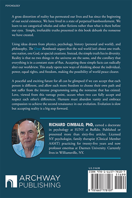 Welcome. My name is Richard Cimbalo, PhD, author of The Great Bamboozle. I’m so happy to have you as a visitor to my blog about my new book. This project is very special to me, and I hope to share some of that excitement with you here. I’ll be using this blog to interact with